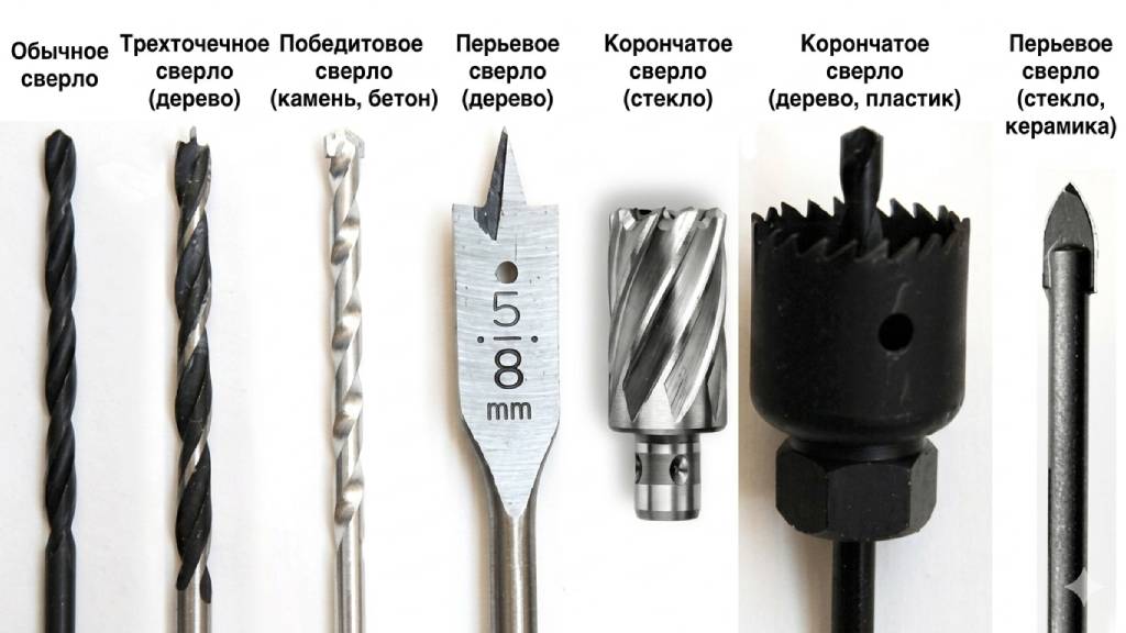 Наиболее простой способ отличить сверла — сравнить их внешние характеристики. Если говорить о винтовых моделях, разница в том, что для работ по древесине наконечник будет заостренный, по металлу более тупой, а для высверливания отверстий в бетоне предусмотрены модели с наконечником, который значительно шире, чем основание. Также обращайте внимание на материал изготовления. Инструмент для древесины изготавливается из мягких сплавов, для металлоизделий и бетона из более прочных — твердых.