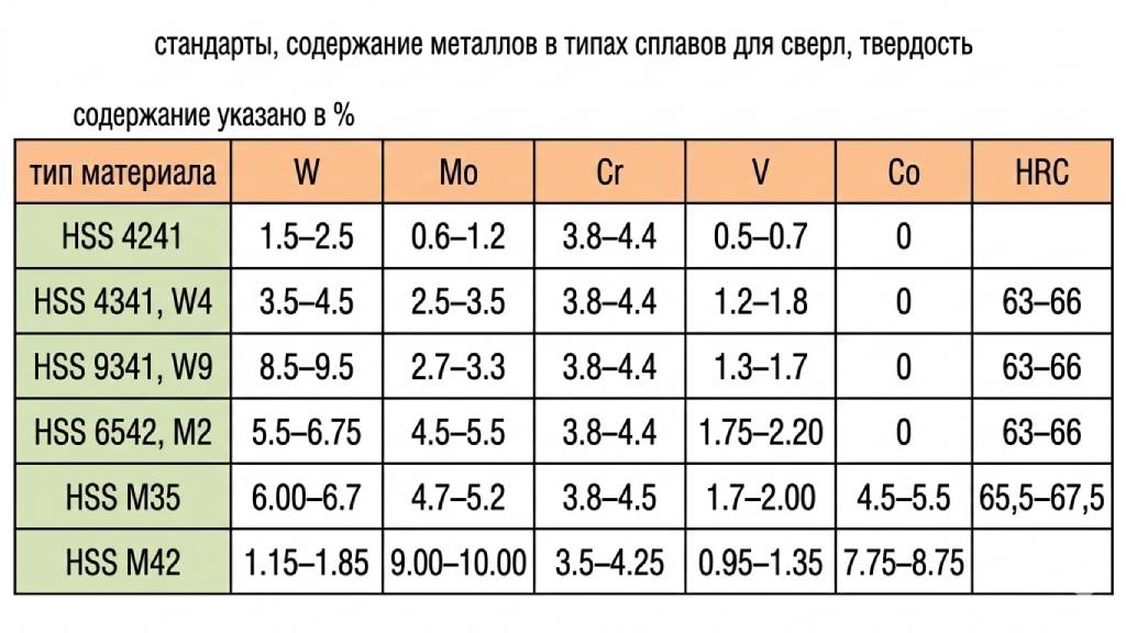 Большинство видов сверл для манипуляций с металлоизделиями изготавливается из быстрорежущей стали с различными добавками. Это может быть кобальт, молибден, вольфрам, или, например, ванадий. Кроме этого, производители предлагают сверла с титановым покрытием.