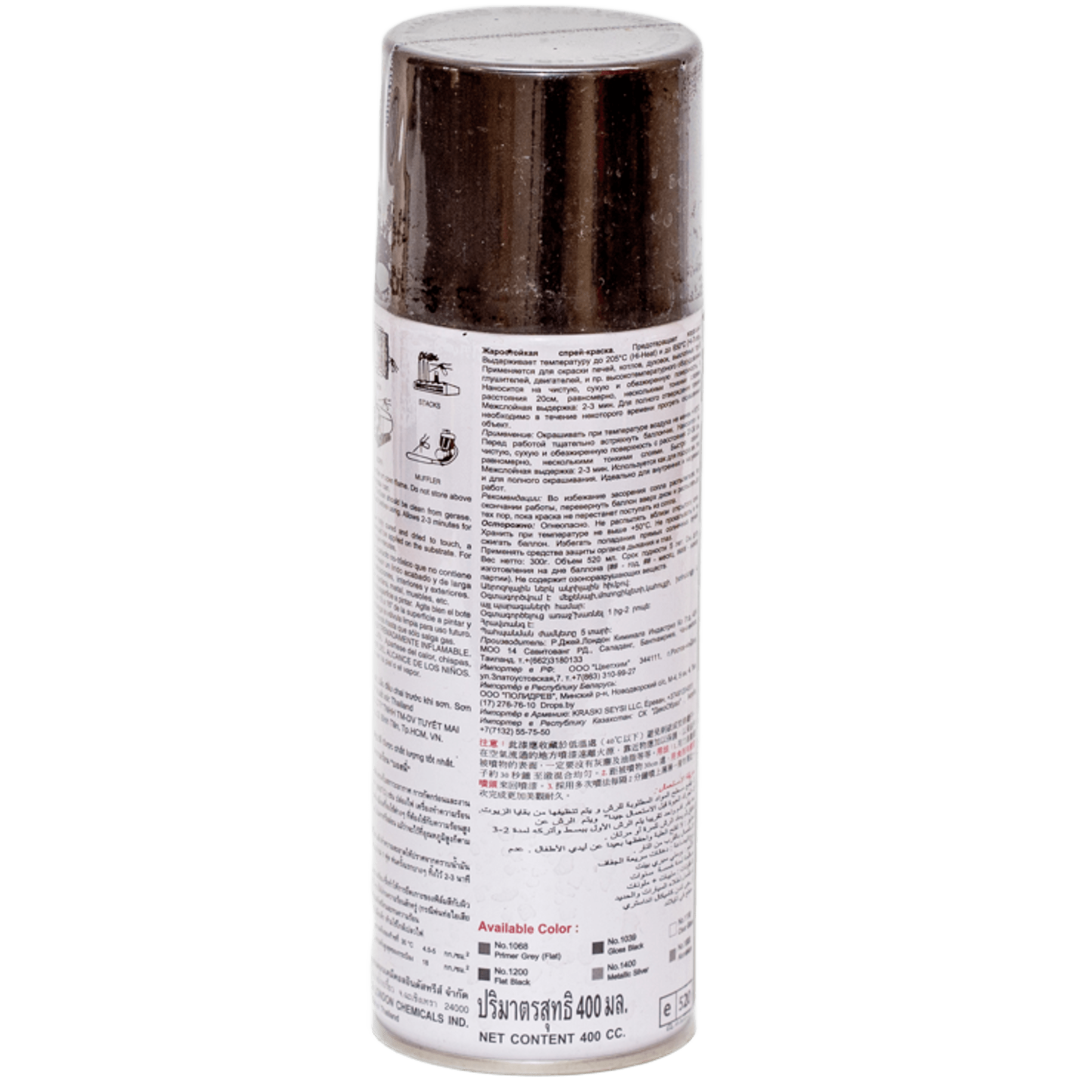 Внимание: термостойкость эмали зависит от цвета: черный, серебро - кратковременная (до 4 часов) - 650°C, долговременная - 400°C; другие цвета - кратковременная (до 4 часов) - 400°C, долговременная - 200°C.