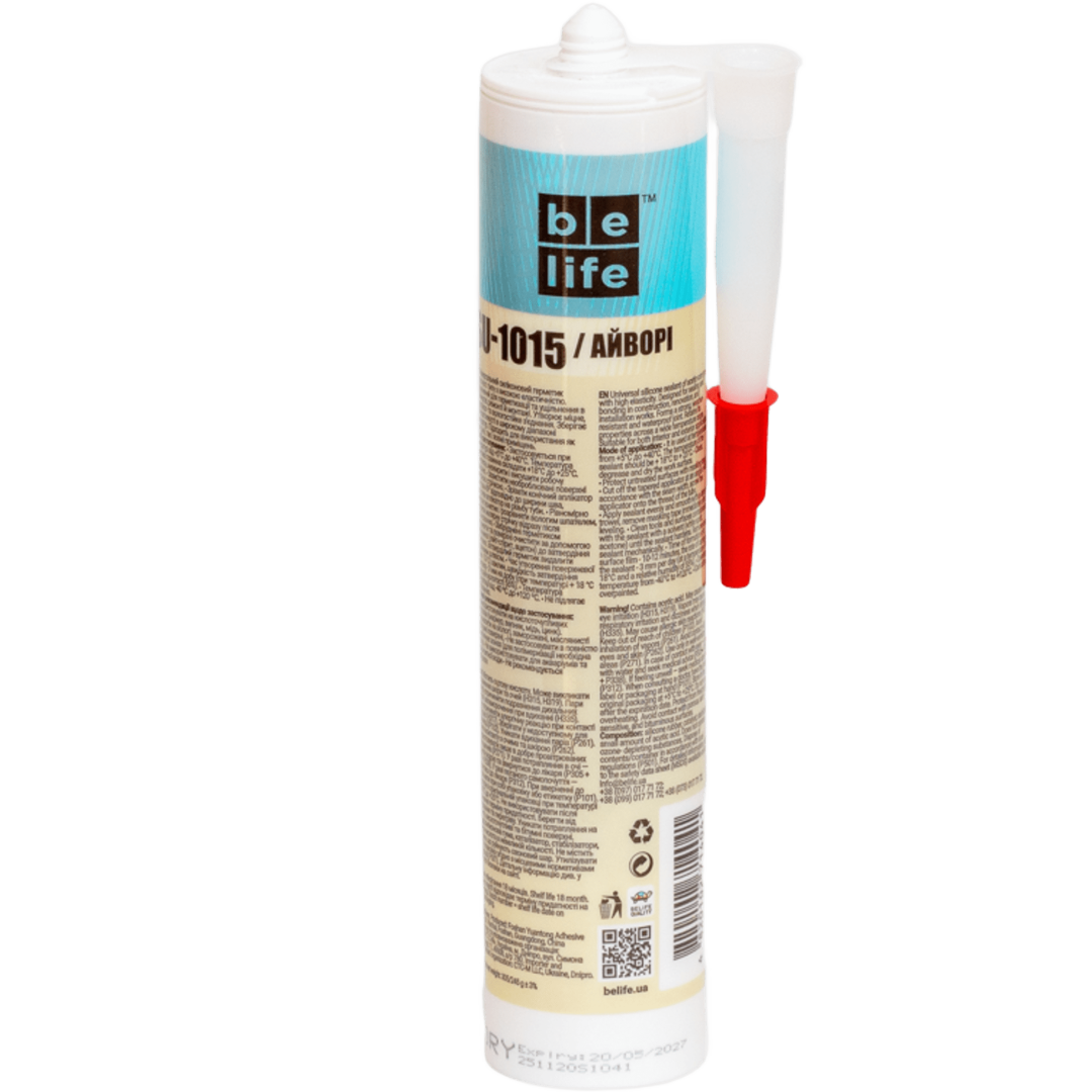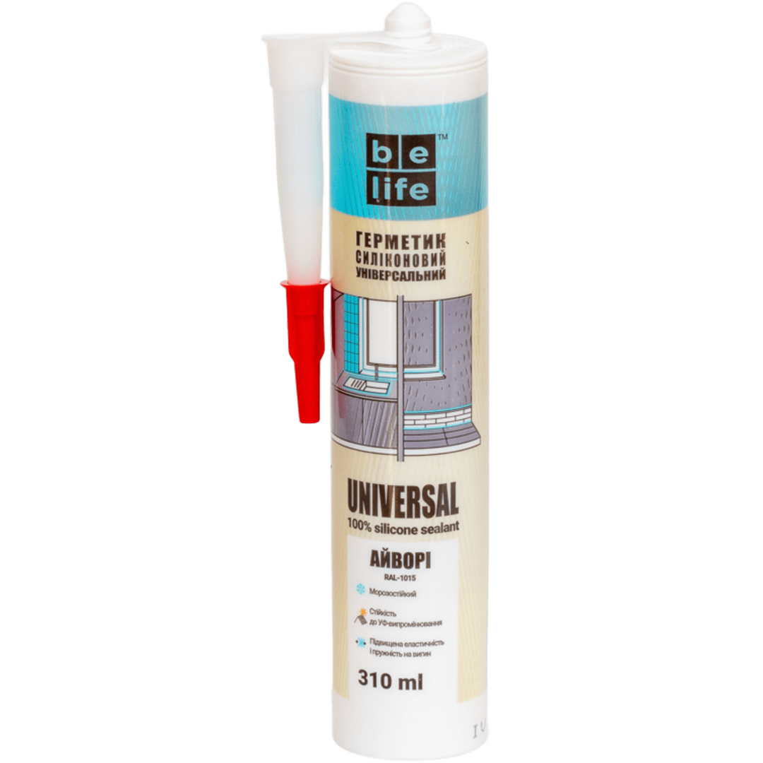 BeLife SILICONE UNIVERSAL - високоеластичний однокомпонентний універсальний силіконовий герметик кислотного типу (має характерний запах оцту під час полімеризації). Має високу адгезію до бетону, цегли, скла, кераміки, дерева, металу, має стабільний колір. Стійкий до інтенсивного стирання та УФ-променів. Висока еластичність після затвердіння. Стійкий до більшості хімічних, чистячих та миючих засобів. Морозостійкість -50°С до + 120°С.